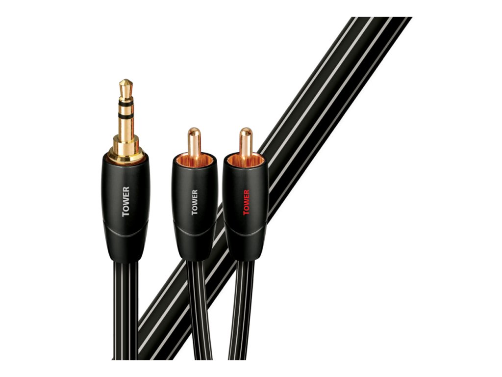 Analógový audio prepojovací kábel Tower 1.0 m s konektormi 3,5 mm jack – RCA využíva pevné vodiče z dlhých medených vlákien (LGC) pre čistejší, detailnejší a prirodzenejší zvuk než pri bežných OFHC kábloch.